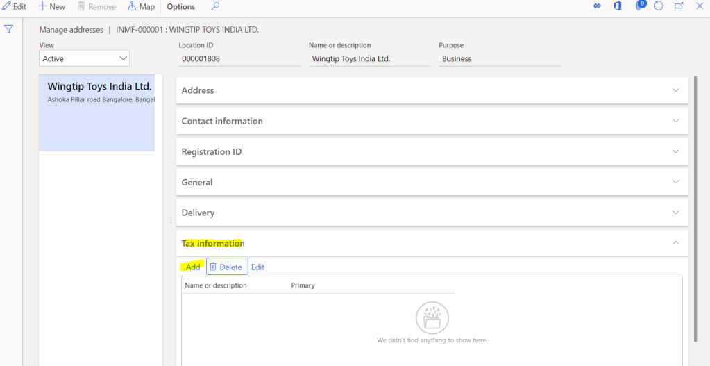If we have inventory products to purchase and sales though site, warehouse then we need to map “GST Registration number” which we have created as master in last blog to all the addresses of site or warehouses.