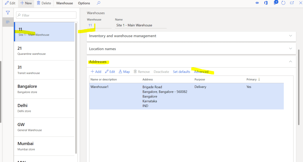 Navigate to, Inventory Management > Setup > Inventory breakdown > Site/Warehouse (I am taking warehouse)