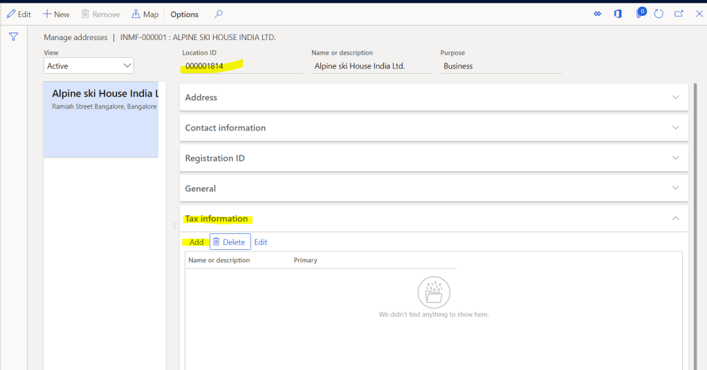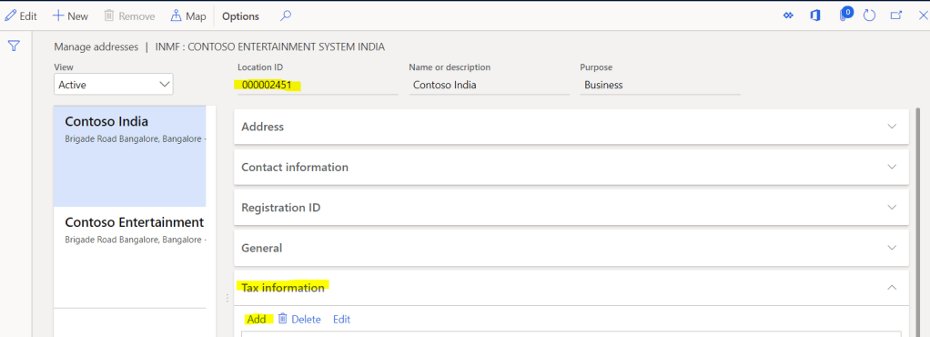 Navigate to, Organization administration > Organizations > Legal entities > Address