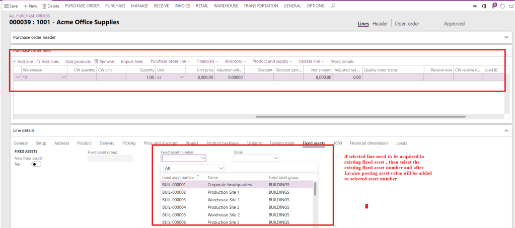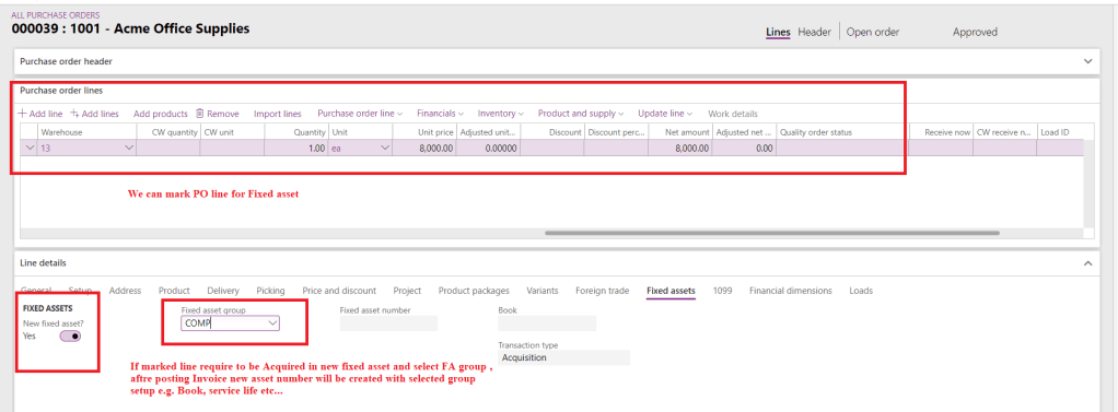 Step-1: Create PO > Add Lines > Specify setup for Fixed asset