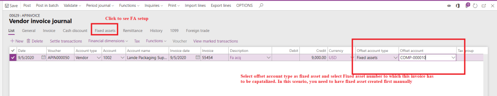 Create fixed asset journal > Add lines for invoice > In offset account type select Fixed asset > Select Fixed asset number