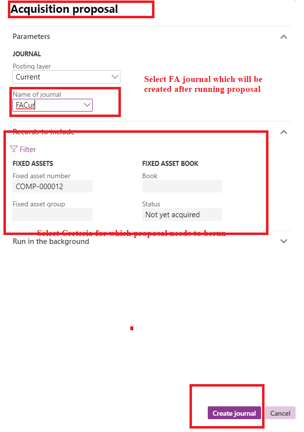 This method can be used when user has many assets created and acquisition cost is specified in master. In this method system creates fixed asset acquisition journal based on proposal criteria and then user can post that journal to acquire the fixed asset.