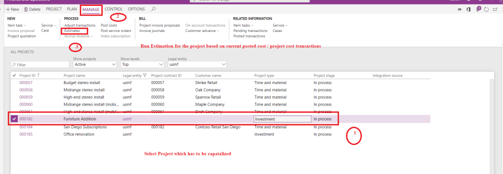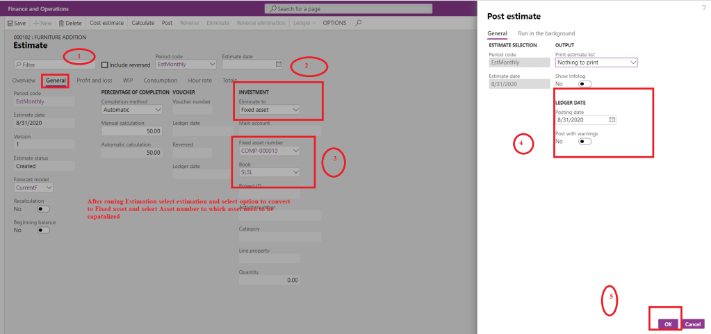 Navigate to Project management and accounting > Select Project > Manage tab > Run estimation > Select Elimination method > Post