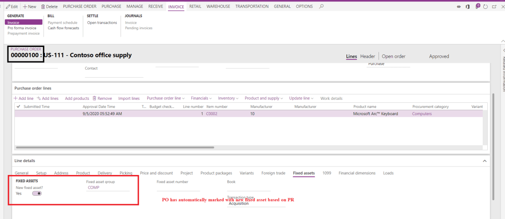 - Purchase requisition > PO > PO Invoice > Fixed asset
