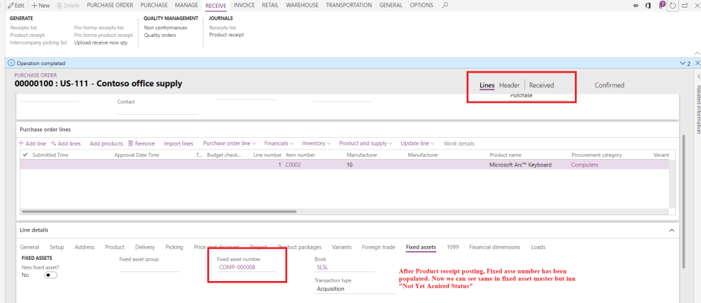 On product receipt posting fixed asset number will be created but with not yet acquire status