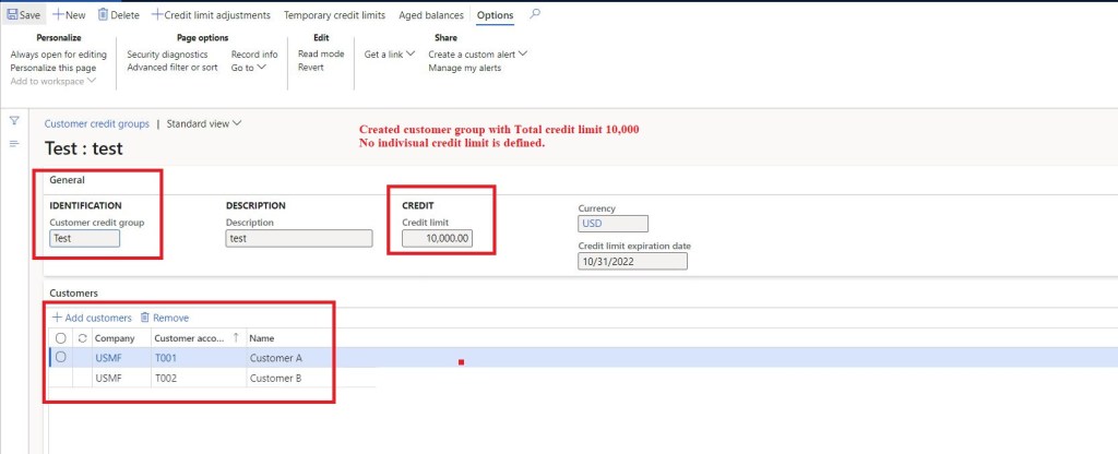 Added customer A and B to Test group, which means both will have shared limit of 10,000